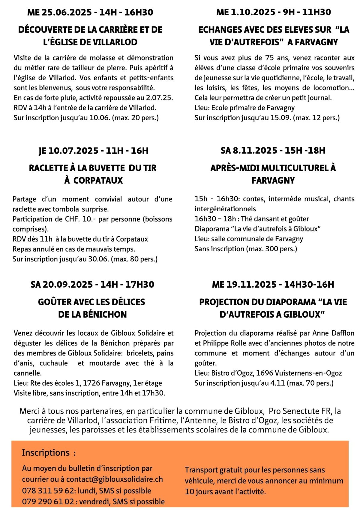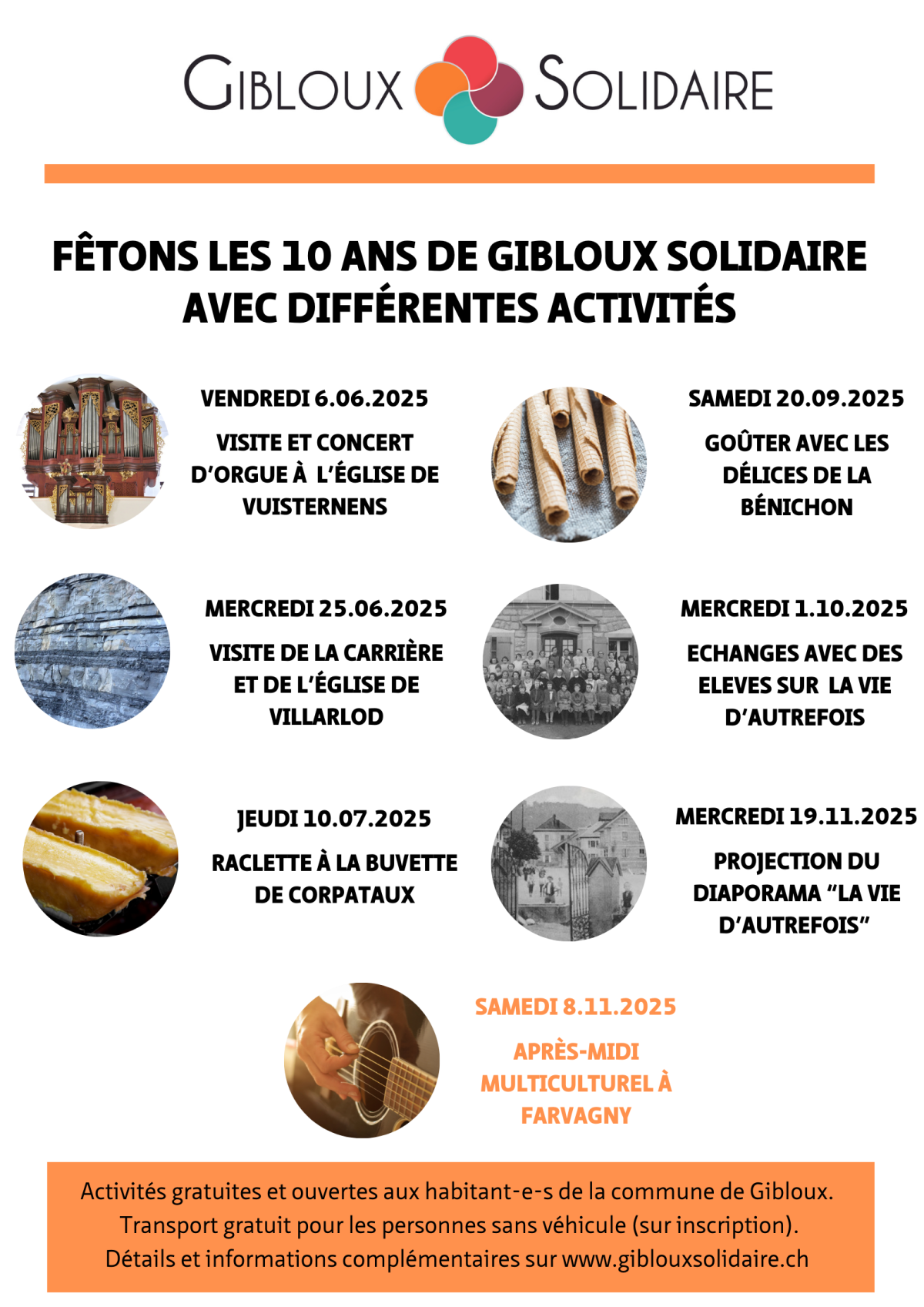 Gibloux Solidaire fête cette année son 10e anniversaire et est ravie de vous inviter à diverses activités organisées spécialement pour l'occasion. N'hésitez pas à vous inscrire en prenant garde aux différents délais.
