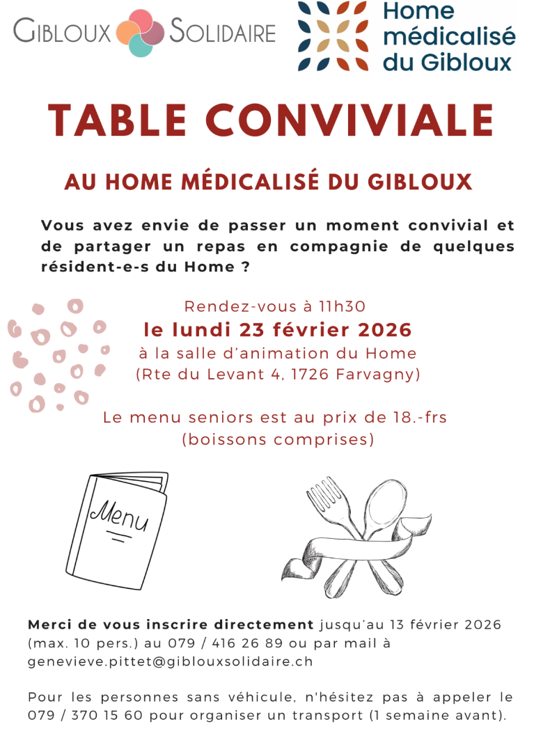 Etre à la retraite n’équivaut pas à un enfermement social ou à une passivité active! Gibloux Solidaire vous propose de participer à une table conviviale et de rompre la solitude du repas quotidien en venant le partager le 1er jeudi du mois.